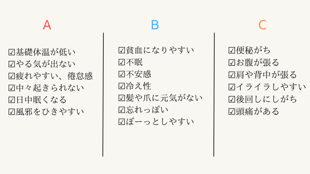 Bが多く当てはまる方は血虚タイプ。